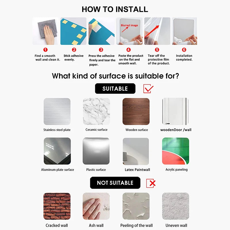 - Installation: Peel-and-stick; remove protective film after placement